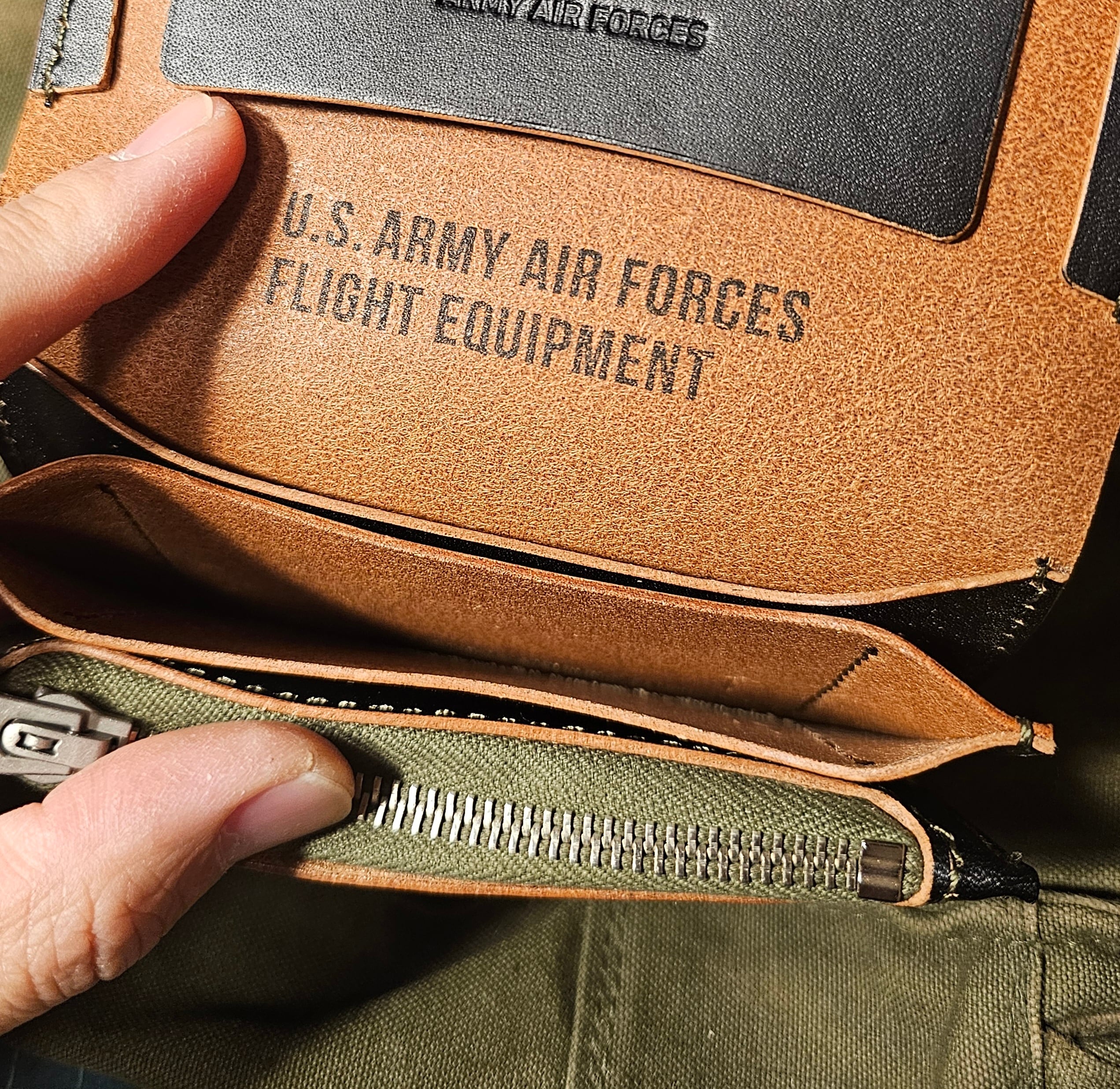 ファスナーテープとステッチには、深みのあるアーミーグリーンをセレクト。黒革と銀色の金属、そしてグリーンのライン。この三色の調和が、デッドストックの軍用装備のような雰囲気を完成させています。